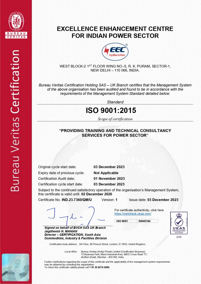 Excellence Enhancement Centre (EEC) for Indian Power Sector is a ISO 9001:2015 Centre Certified by M/s Bureau Veritas India Pvt. Ltd.